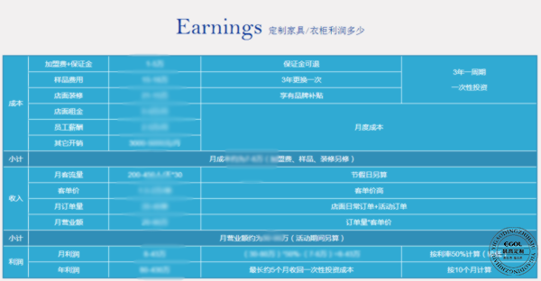 說到賺錢,利潤肯定是最主要的。按照易高定制家居近期統計的150㎡店面正常情況下的利潤大概在8萬以上,具體的也可以點擊圖片查看詳細計算方式。 開店大大小小的注意事項非常多,一些沒有涉足過創業的上班族來說,如何辦理營業執照、稅務登記、店面裝修等也會是較為復雜的問題,易高定制家居對于每一位加盟商有專業加盟經理一對一負責,實時解決創業者后顧之憂。