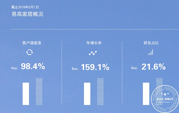 歷經15年品牌積淀,易高家居逐漸成長為成熟的定制企業,截止2018年5月,相較2017年易高家居增長率高達159.1%,如此迅猛的增占率讓易高為更多消費者和行業所認可,也奠定了其全屋定制一線品牌的地位。