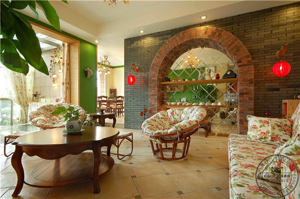 歐式田園風格,設計上講求心靈的自然回歸感,給人一種撲面而來的濃郁氣息。把一些精細的后期配飾融入設計風格之中,充分體現(xiàn)設計師和業(yè)主所追求的一種安逸、舒適的生活氛圍。這個客廳大量使用碎花圖案的各種布藝和掛飾,歐式家具華麗的輪廓與精美的吊燈相得益彰。墻壁上也并不空寂,壁畫和裝飾的花瓶都使它增色不少。鮮花和綠色的植物也是很好的點綴。