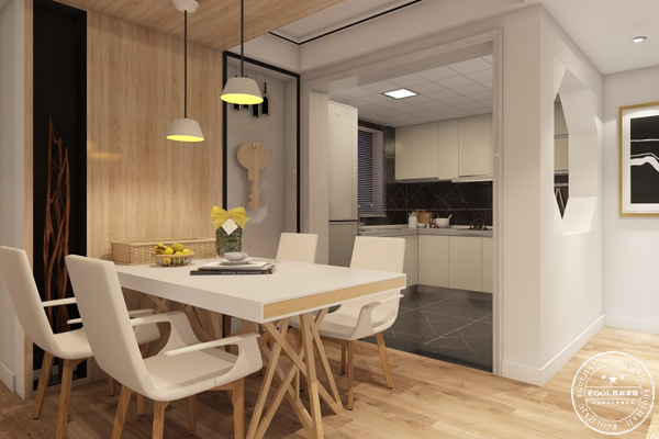 餐廳空間一般使用燈具、木質(zhì)家具搭配,還可營造出北歐一貫的自然與簡潔。白墻上再添置一些置物架設(shè)計,擺放飾品增添居室活力。