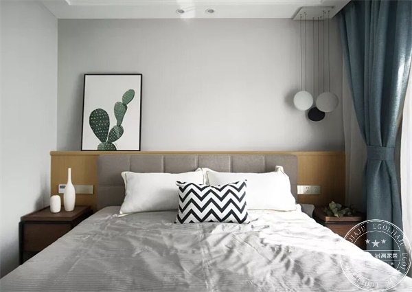 夏天陽光照射,避免感覺太熱,業主聽隨設計師意見采用藍色的窗簾降溫,其他小飾品推薦選購柜貓家居軟裝飾品,或者淘寶一些物美價廉的單品。因臥室業主不準備放電視,所以設計做了一套梳妝臺和矮柜,增加儲物空間。