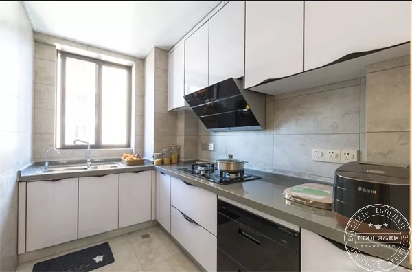 L型廚房,設計采用白色整體櫥柜,操作臺較大,可同時容納兩三人同時作業。廚房開窗,采光好、通風性強;在這樣干凈、明亮的廚房作業,心情美美噠。