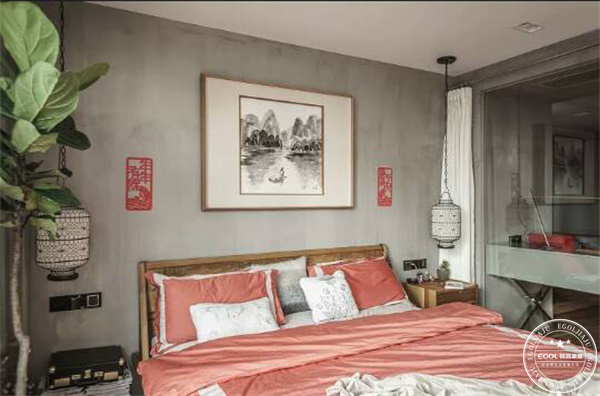 透過玻璃看主臥,最混搭的角落沒有之一;定制的木線條及帆布襯布裝裱,內藏燈光。臥室玻璃門鎖采用隱蔽式地插銷