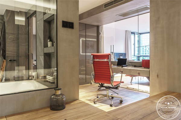 將原客衛加大,改為主衛,融入了浴缸和雙人而盆及寬大的臺面。而衛生間與臥室之間的過道則與原主衛的部分空間合并,變成了書房空間,工作椅的活動區城與過道共用區域原次臥的墻體也被拆除,設置了地臺,與書房空間在高度上予以區分,看似減少一個房間,實際當偶爾需要臨時住人是的地鋪。