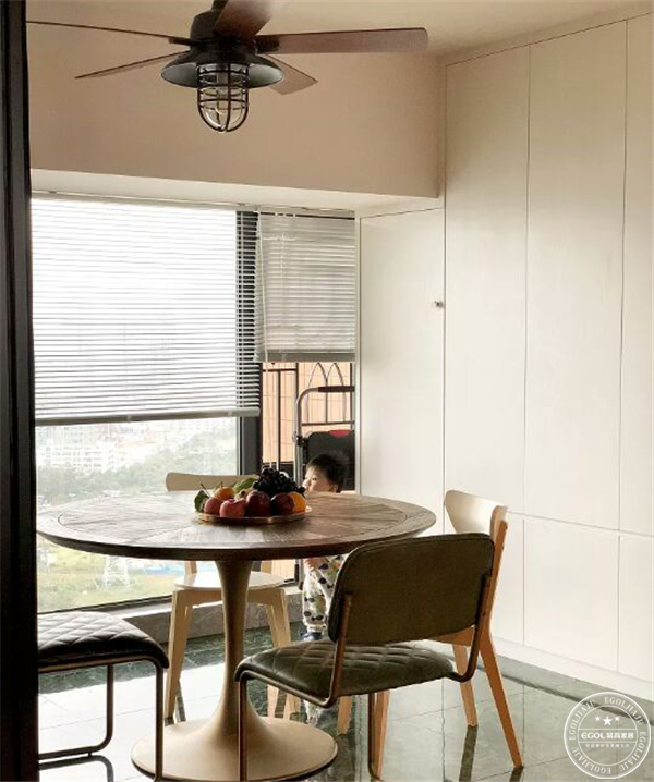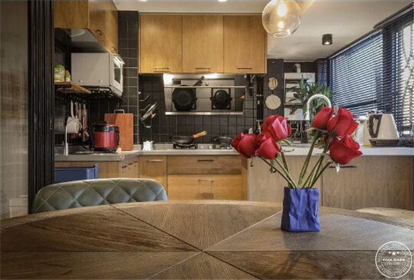 和廚房“混為一談”的餐廳設計接近方形,滿足業主圓桌心愿,最多可以坐六個人。,兩張皮椅很提氣,一張棕色,一張墨綠,不用擔心油煙會污染真皮,用專門的皮具濕巾一周擦一次足矣。
