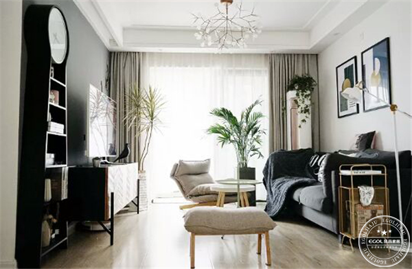 業主三十來歲,不再凡是羨慕妒忌,內心平靜而美好。客廳深色系為主色調,窗簾選用豆灰色,在光線的照射下偏米色,不顯太冷也不會太暖。