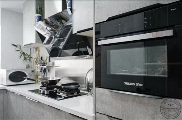 整體櫥柜選用了水泥灰的柜門,耐臟顏值高;左邊貼的小白磚,女主想做成西廚。
