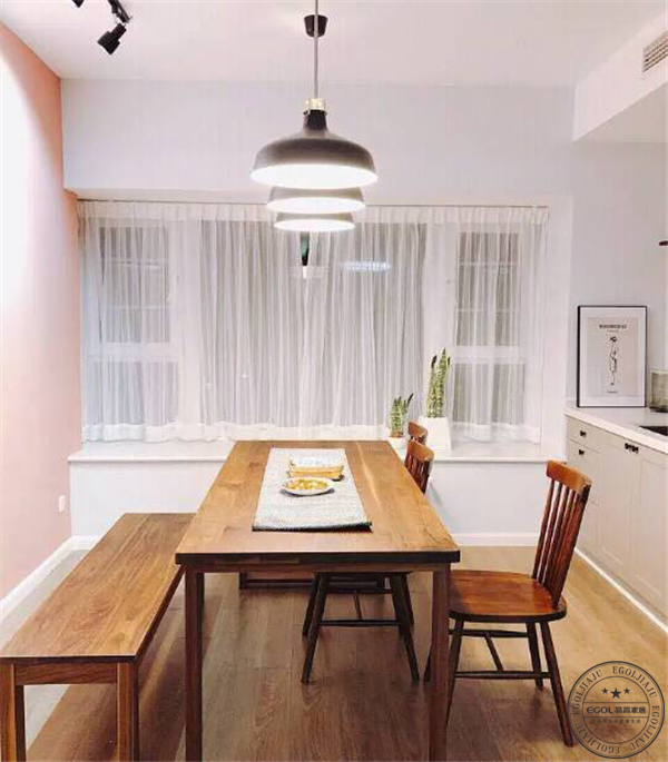 木色的不同餐桌椅設計,隱約有一點傳統日式迷人的儀式感,又不失現代生活的溫馨,細節上的心機為生活增添樂趣。將餐廳配置在窗戶旁邊,除了可以讓光線變得更加明亮,也有利于食物的氣味排除。北歐式吊燈和綠色植物讓整個氣氛優雅大氣且充滿生機。