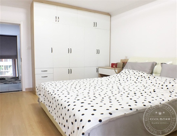 臥室采用了現代簡約風的設計,搭配原木色系的木地板,光線充足,床頭的兩邊柜雖然大件的物品放不下,但還是能夠收納很多零零散散的物品。這樣的設計營造出北歐風特有的自然舒適之感,讓居住者倍感溫馨。
