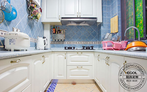 L字型廚房的兩邊至少需要1.5米的長度,其特色就是將各項配備依據烹調順序置于L型的兩條軸線上。但為了避免水火太近,造成作業上的不便,最好將冰箱與水槽并排于一直線,而爐具則置于另一軸線。如果想要在烹調上更加便利,可以在L型轉角靠墻的一面加裝一個置物柜,既可增加收藏物品的容量,也不占用平面空間;也可在L型的軸線上繼續延伸,設計一個可以折疊或拉出式的置物臺面,平時不用時可收起,待烹調料理多時再開啟使用。