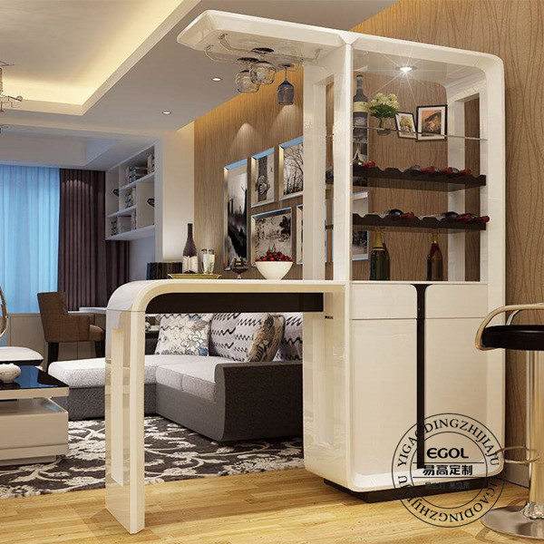 如果客餐廳面積較大,可以嘗試使用吧臺式酒柜,這種設計比較符合現代家庭,三五好友相聚吧臺品酒,或是家中隨意做份小甜點于吧臺也是很方便的。如果普通面積的房型可以選擇隔斷式酒柜或是靠墻酒柜,選擇靠墻酒柜的話是比較有利于酒柜設計和擴充其儲物能力的。