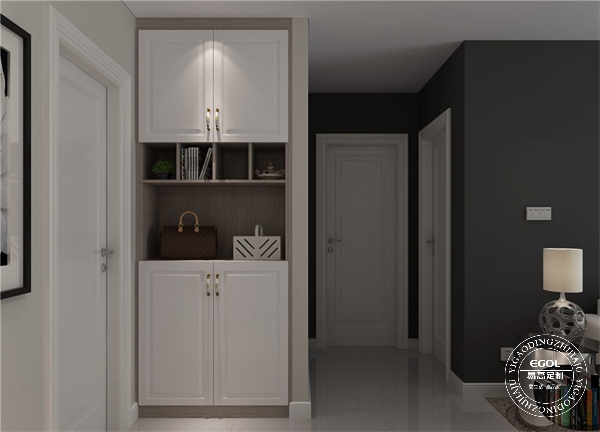 整體色調是銀灰色柜體搭配白色造型柜門,鞋柜采用地柜+吊柜的造型,中間部分用擱板隔出四個區(qū)域,分區(qū)更科學合理,下面的空間則為包包、雨傘提供了一席之地。整體嵌入墻體,不占用空間也是非常人性化的選擇。