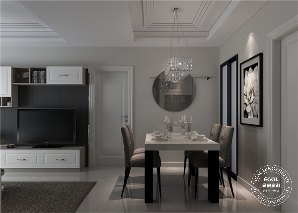 客餐廳并沒有做隔斷區(qū)分開,空間打通讓光線進入家庭生活空間的每一個部分,餐桌椅也是灰色調質感十足,餐桌上方小型水晶吊燈讓用餐也不失精致。頂部吊頂造型立體之感躍然而出。