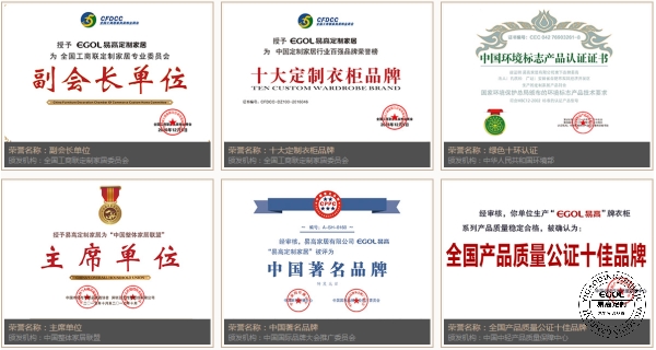 品牌榮譽:易高品牌發展至今,品牌榮譽自是數不勝數。“全國工商聯定制家居委員會副會長單位”“定制衣柜十大品牌”“中國整體家居聯盟主席單位”“十環認證”“消費者喜愛品牌”等等彰顯了易高在行業內的知名度與認可度。