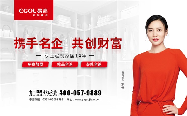 我們首先了解下易高品牌底蘊。易高定制家居(EGOL全屋定制)始于2004年,是集研發、設計、生產、銷售、服務于一體的全屋定制家具加盟品牌,產品覆蓋了從臥室到書房、從餐廳到客廳等多個空間,以實木、板木、模壓、板式等系列為主。2015年簽約影后宋佳代言,全面提升品牌形象。